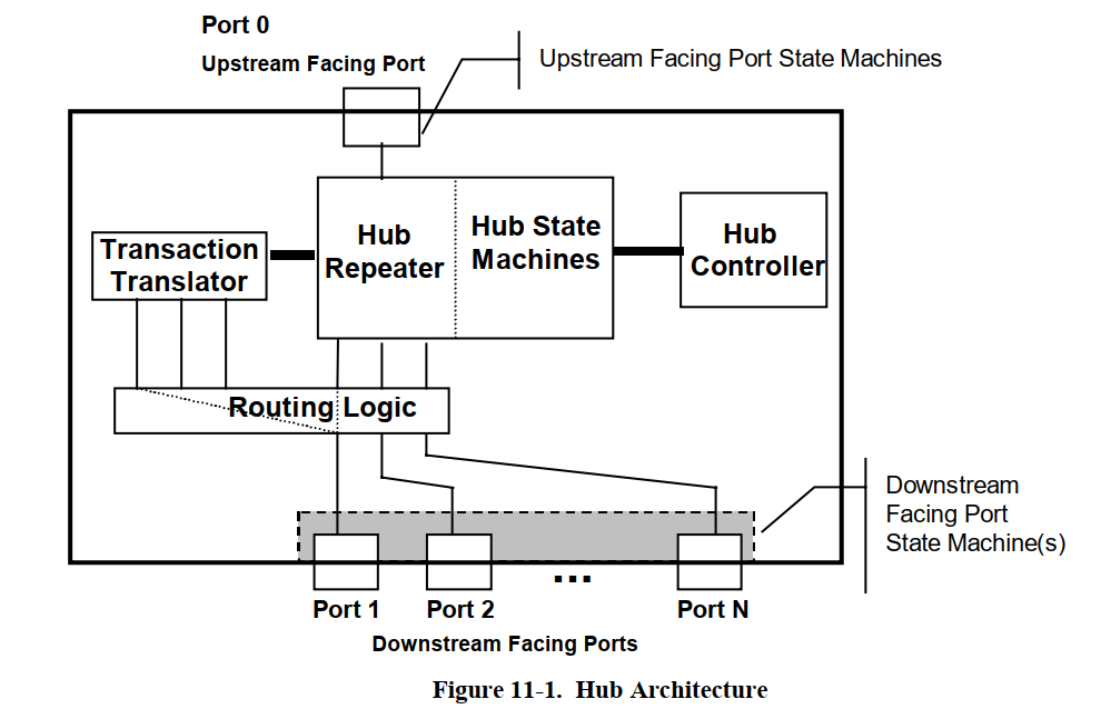 - 集线器控制器(the Hub Controller):提供主机到集线器通信的机制。特定于集线器的状态和控制命令允许主机配置集线器,并监视和控制其各个面向下游的端口。