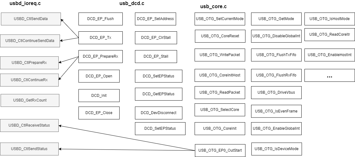 上面有一部分的调用关系并未画出,不过可以看出来,usb_core.c是封装的最基本的寄存器操作,而usb_dcd.c又是调用的是usb_core.c,而usbd_ioreq.c又是最顶层的设备API函数。