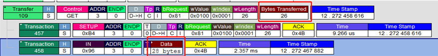 通过USB协议分析仪抓包数据发现,第一个GET CUR 的请求的数据长度是26个字节,而发送了28个字节