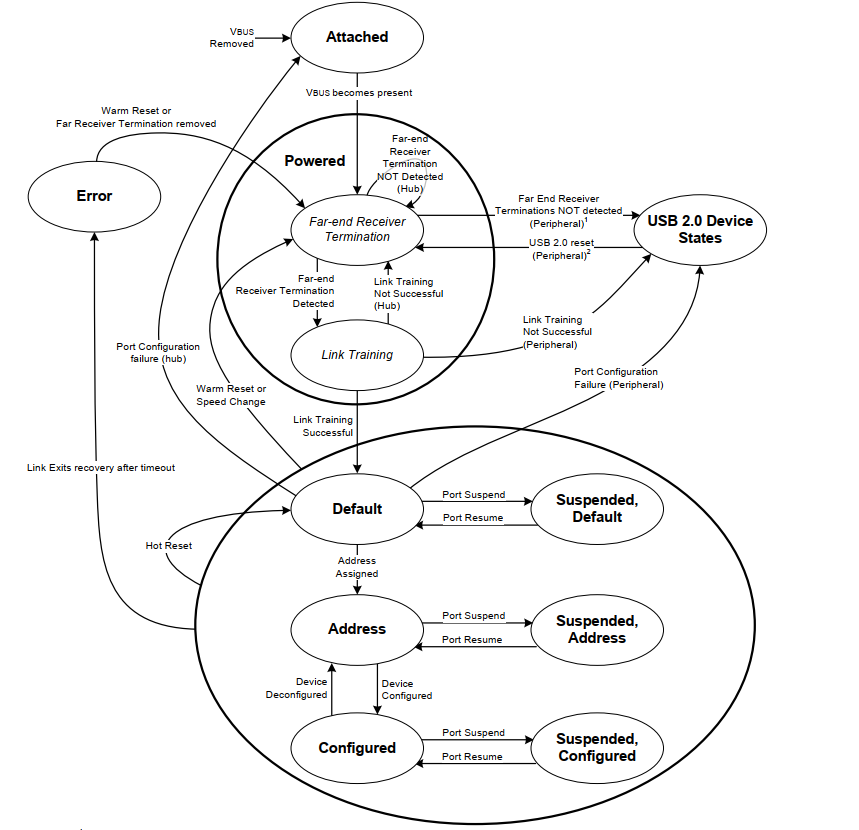 USB3.2超高速定义了7种设备状态,比以往多了一个错误状态。