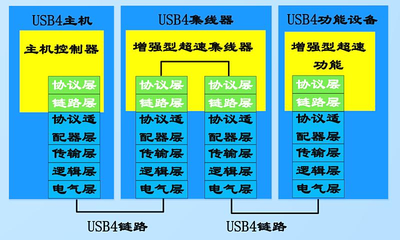 下图展示了USB3从USB4主机到USB4集线器,最后到USB4功能设备的传输涉及的功能堆栈。其中白色字体协议层、链路层是USB3定义的协议栈,而黑色字体的协议适配器层、传输层、逻辑层和电气层是USB4定义的协议栈。
