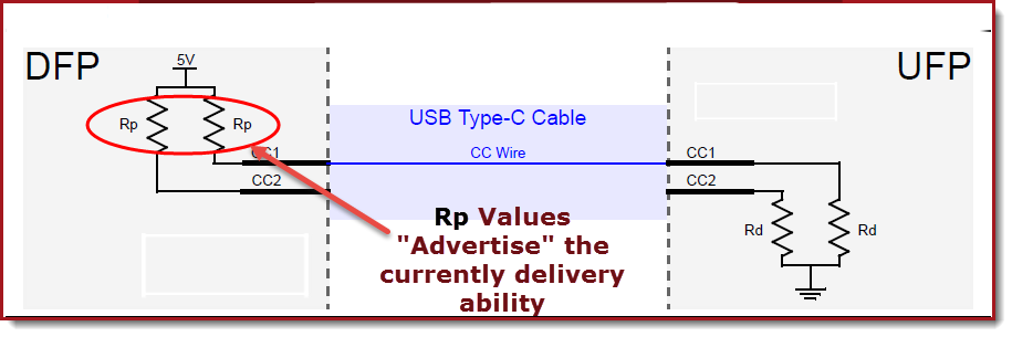 Type-C 系统能够提供比 2.0 / 3.x 系统的默认功率更多的功率。Type-C 系统提供的电量可能因系统而异。使用连接到 CC1 和 CC2 信号的上拉电阻(Rp),Type-C DFP 向 UFP 它们提供超过 USB 默认功率的电流的能力。